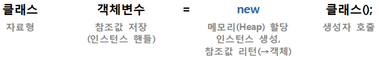 - new 연산자를 통해 메모리(Heap 영역)에 데이터를 저장할 공간을 할당받고 그 공간의 참조값(reference value /해시코드)을 객체에게 반환하여 주고 이어서 생성자를 호출하게 된다.