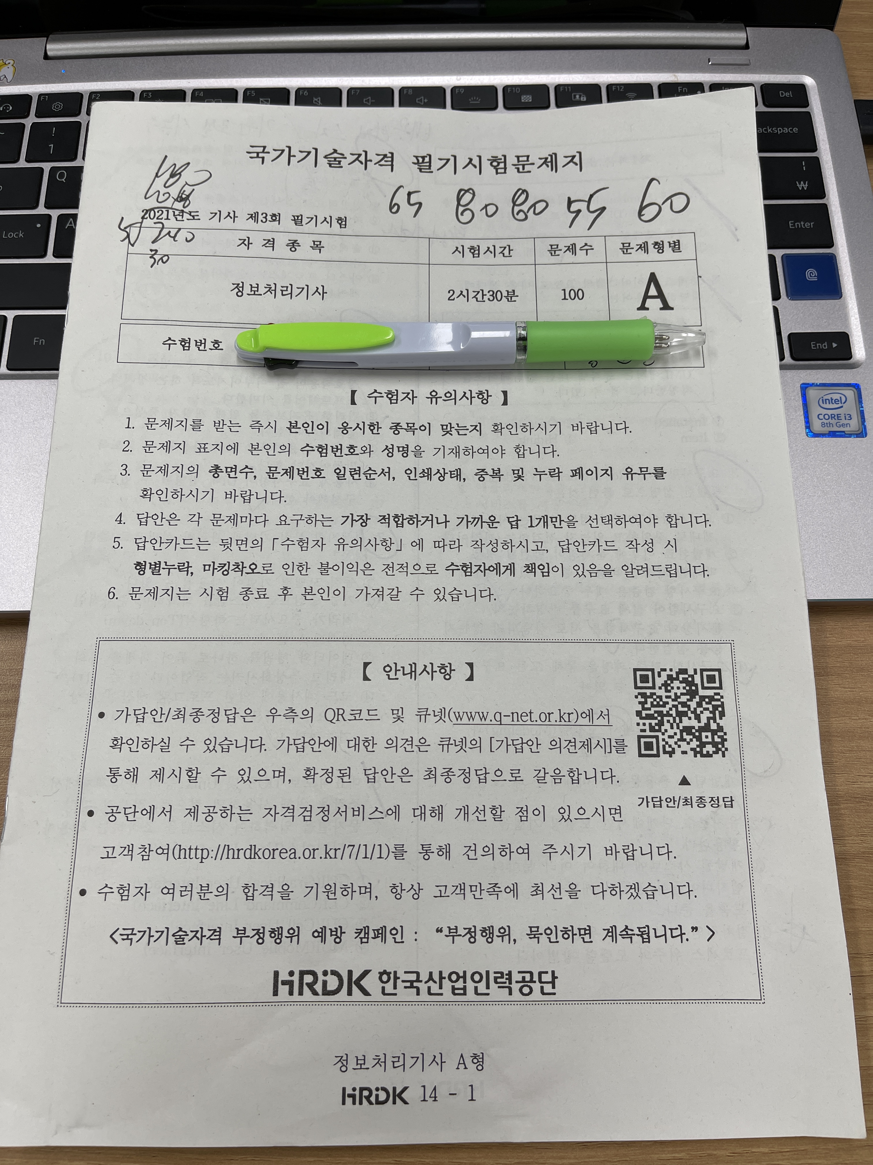 : 최신 5개년을 풀어본 입장에서 시험지를 받았을때 떨어졌다는 생각이 들었다. 내가 정처기 시험을 대비하면서 접한 많은 기출문제가 열문제도 체 되지 않았다. 그러나 5개년을 보면서 봐왔던 개념들을 토대로 선지 하나하나 지워가며 꾸역꾸역 풀었다. 필자의 경우 현재 개발자로 일을 하고 있어 코딩문제 같은 경우 보다 쉽게 넘어갈 수 있었다.(C는 몰라서 틀렸다. 허허;;)