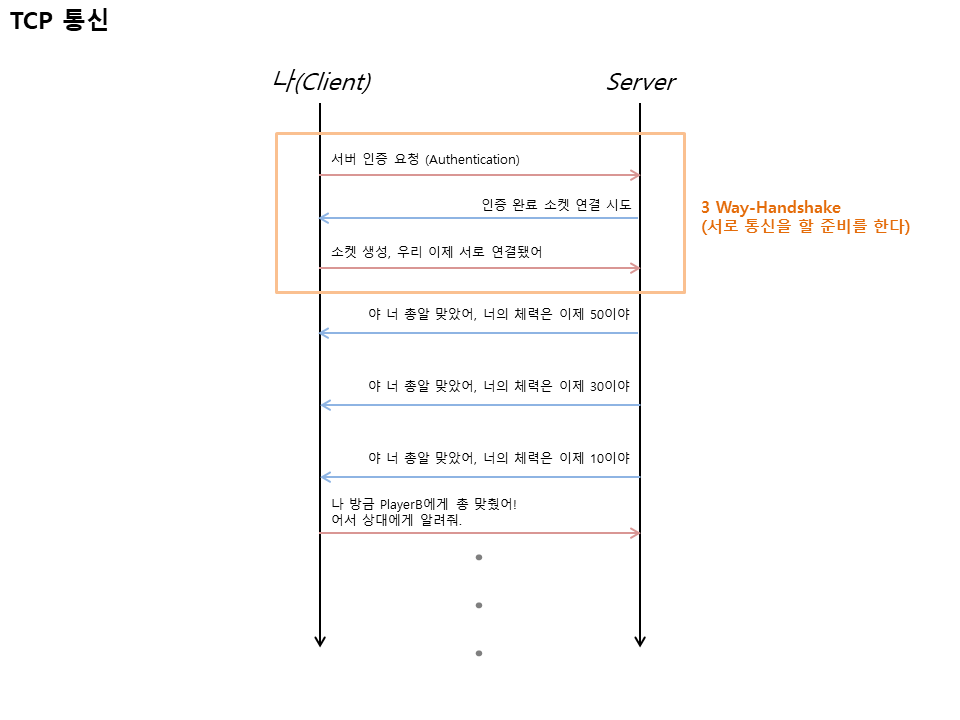 -. TCP 통신은 Handshake라는 과정으로 서로가 통신 할 수 있는 상태인지를 먼저 인증 후에 통신.