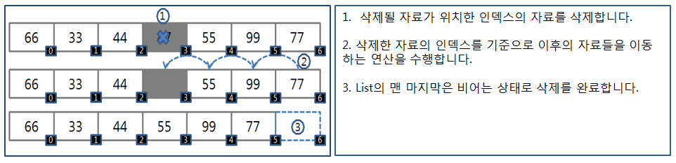ArrayList에서 특정 인덱스의 객체를 제거하게 되면, 제거한 객체의 인덱스부터 마지막 인덱스까지 모두 앞으로 1칸씩 앞으로 이동한다. 객체를 추가하게 되면 1칸씩 뒤로 이동하게 된다. 인덱스 값을 유지하기 위해서 전체 객체가 위치가 이동한다.